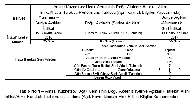 Gemi 15 Ekim 2016’da Rusya’dan yola çıkmış, 08 Kasım 2016’da Suriye açıklarına intikal edebilmiştir. İntikal süresi takriben 25 gündür. Rusya, 06 Ocak 2017’de Suriye'deki askeri güçlerini azaltma kararı kapsamında uçak gemisinin bölgeden ayrılacağını açıklamış ve Amiral Kuznetsov görevi hitamında 07 Şubat 2017’de tekrar Rusya’ya geri dönmüştür. Geri intikal süresinin de takribi 25 gün olabileceği değerlendirilmektedir. Kuznetsov intikallerle birlikte toplam 3.5 ay üssünden ayrı görev yapmıştır. Bu muhtemel açık kaynak bilgilerine göre, 50 gün intikal süresi dikkate alındığında; harekat sahasında yaklaşık 63 gün kalınmıştır. Rusya Kuzey Filosu Komutanı Nikolay Yevmenov, uçak gemisinden 117'si gece olmak üzere toplam 420 sorti yapıldığını ve arama ve kurtarma operasyonları için de 750 sorti gerçekleştirildiğini beyan etmiştir. Bununla birlikte; Suriye’de 1000’den fazla terör hedefini imha ettiklerini vurgulamıştır. Sadece açık kaynaklardaki bilgiler kapsamında elde edilen yukarıdaki teyidi gereken muhtemel bilgilerle, geminin intikal ve hava harekatı performansını makale referanslarının altında yer alan tabloda kabaca bulabilirsiniz.